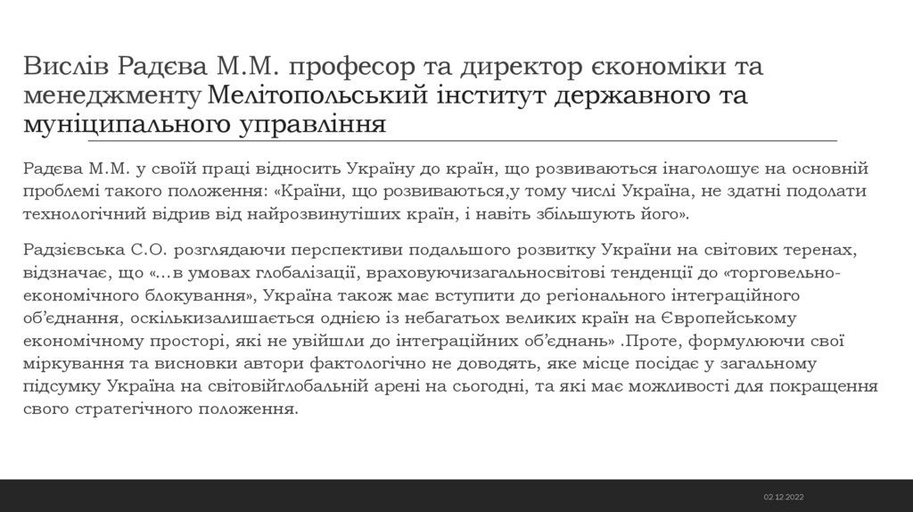 Вислів Радєва М.М. професор та директор єкономіки таменеджменту Мелітопольський інститут державного та