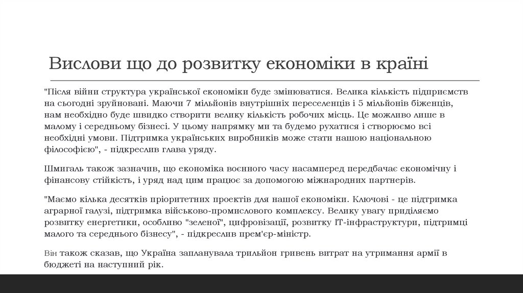 Вислови що до розвитку економіки в країні"Після війни структура української економіки буде змінюватися. Велика кількість підприємств