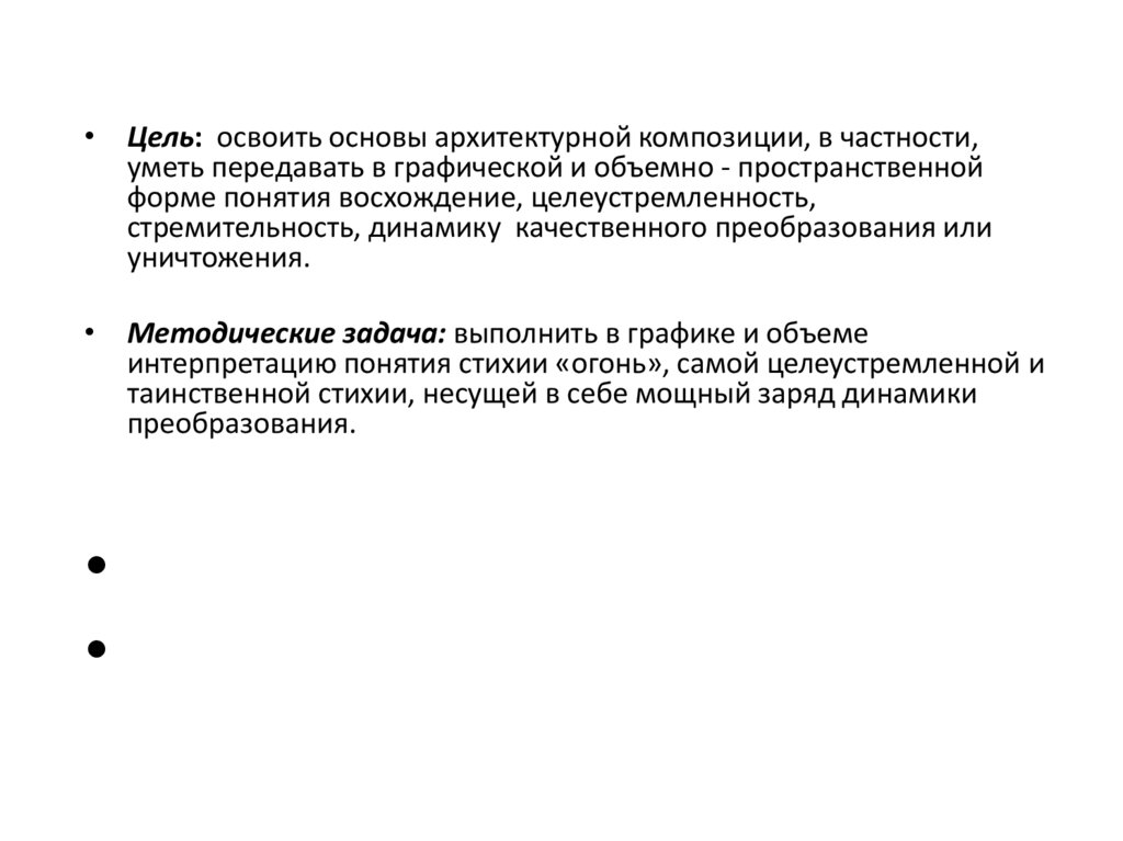 • Цель: освоить основы архитектурной композиции, в частности,уметь передавать в графической и объемно - пространственной