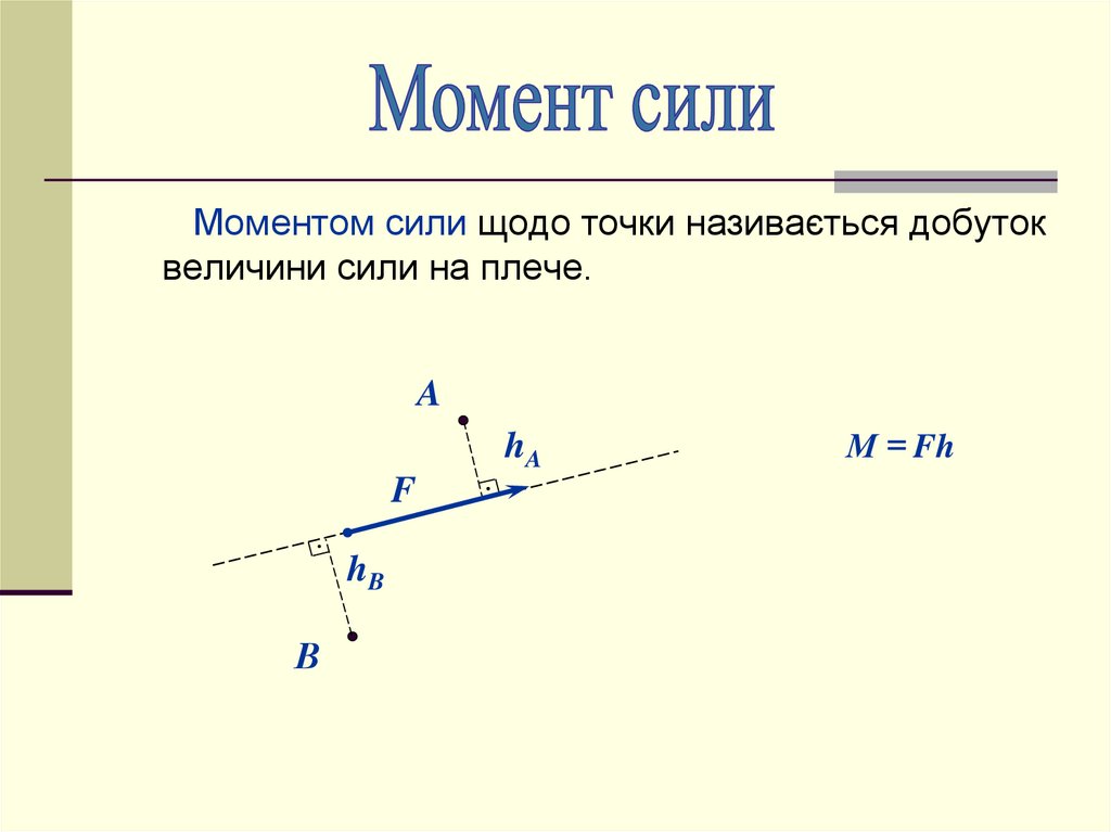 Моментом сили щодо точки називається добутоквеличини сили на плече.