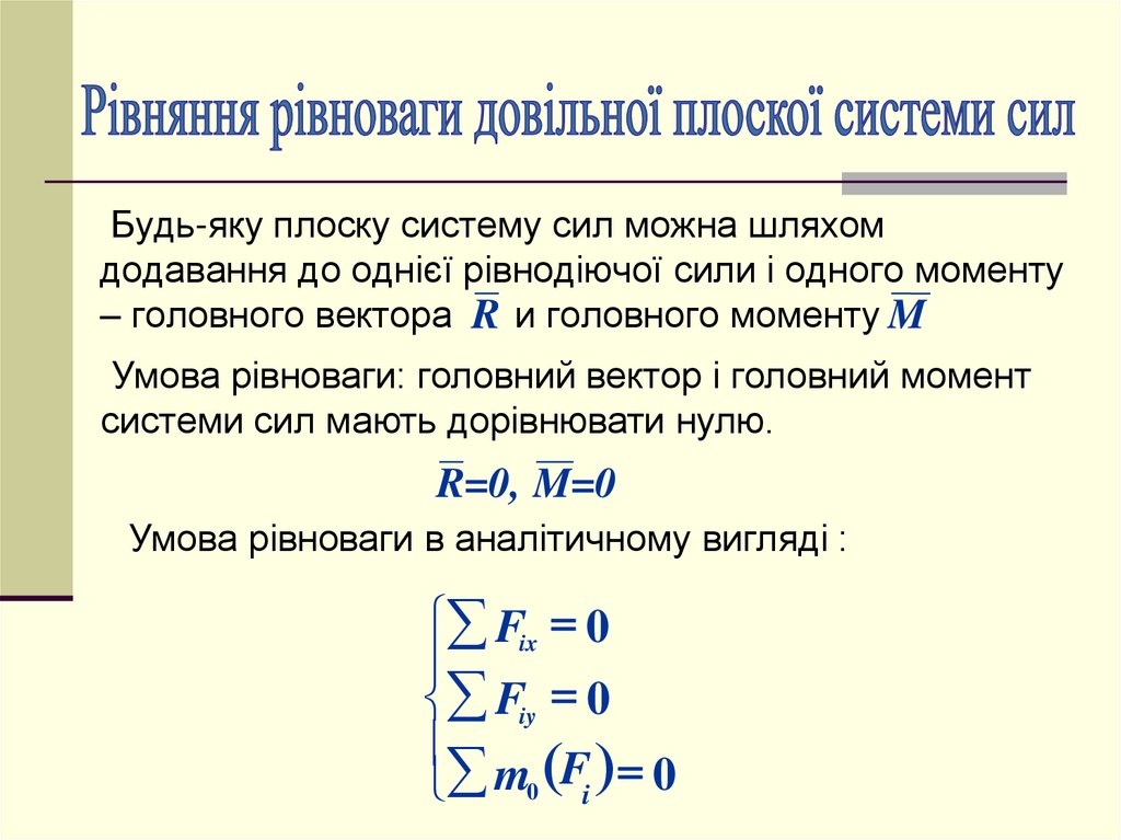 Будь-яку плоску систему сил можна шляхомдодавання до однієї рівнодіючої сили і одного моменту