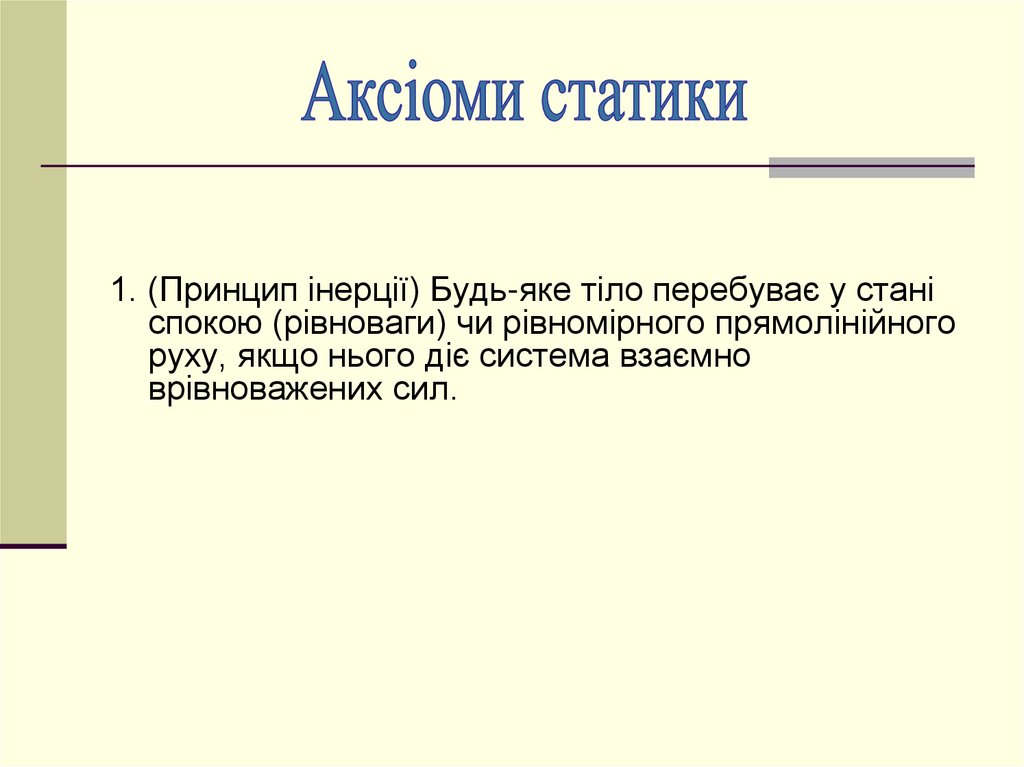 1. (Принцип інерції) Будь-яке тіло перебуває у станіспокою (рівноваги) чи рівномірного прямолінійного