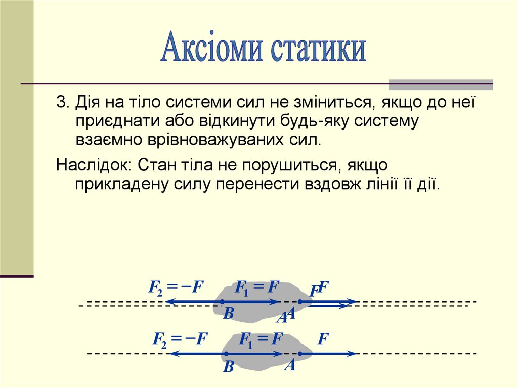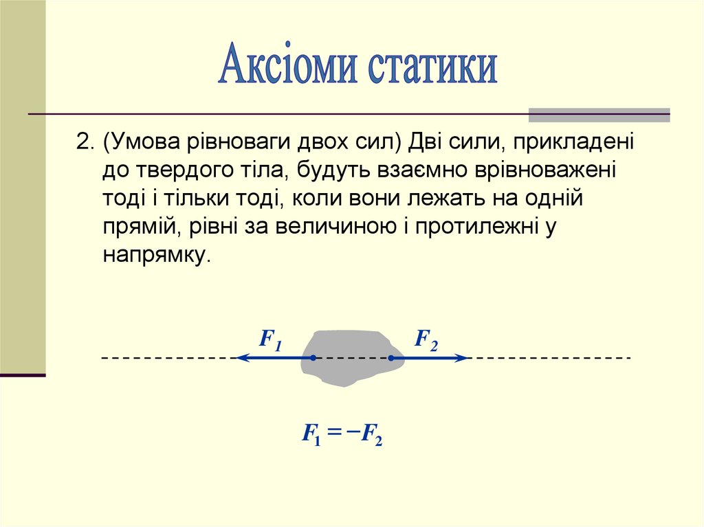 2. (Умова рівноваги двох сил) Дві сили, прикладенідо твердого тіла, будуть взаємно врівноважені