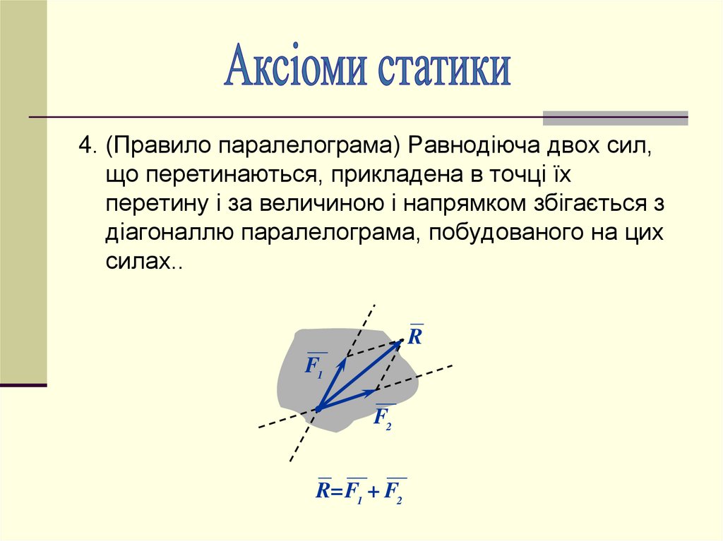 4. (Правило паралелограма) Равнодіюча двох сил,що перетинаються, прикладена в точці їх