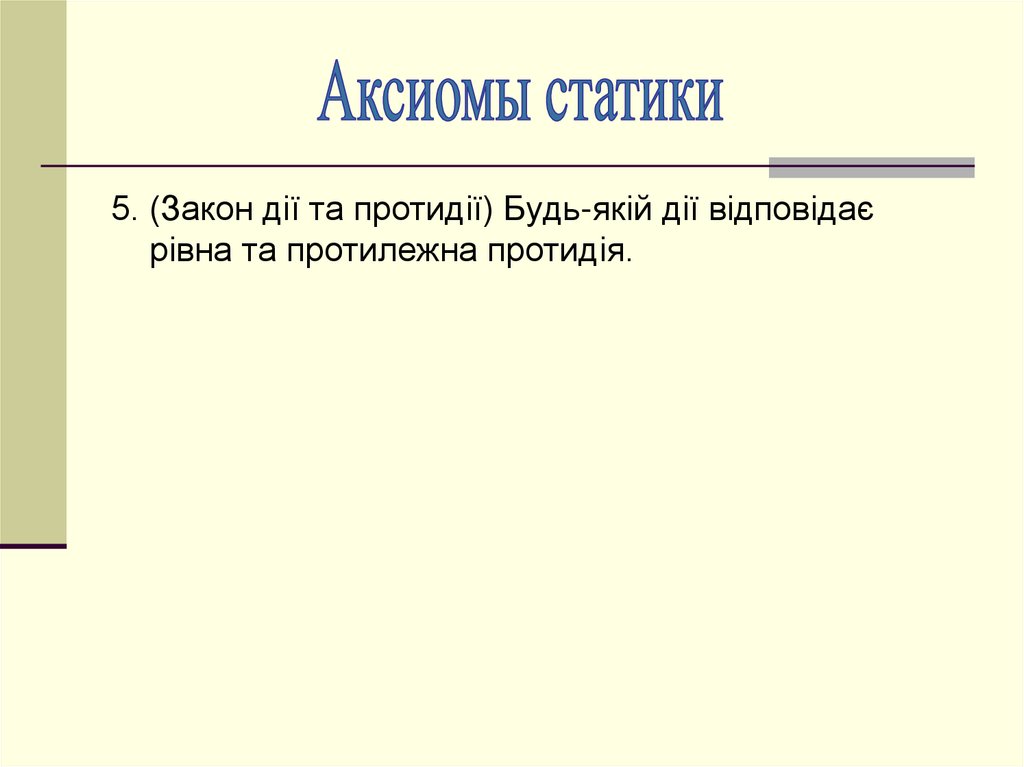 5. (Закон дії та протидії) Будь-якій дії відповідаєрівна та протилежна протидія.