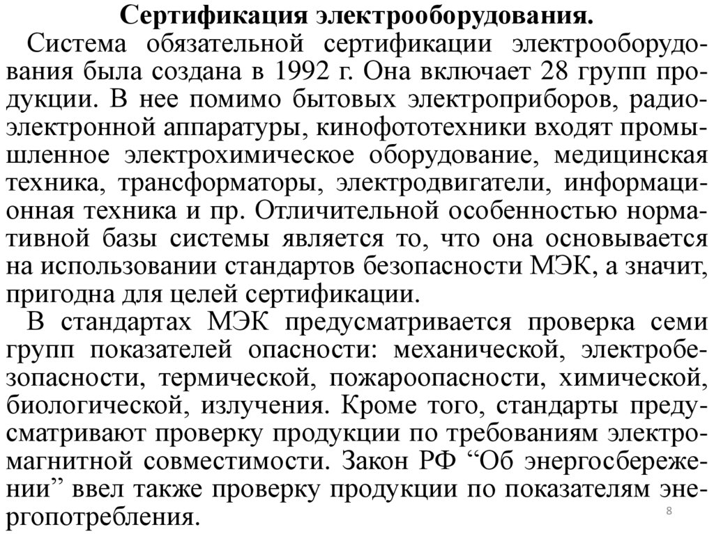 биологической, излучения. Кроме того, стандарты предусматривают проверку продукции по требованиям электромагнитной совместимости. Закон РФ “Об энергосбережении” ввел также проверку продукции по показателям эне8