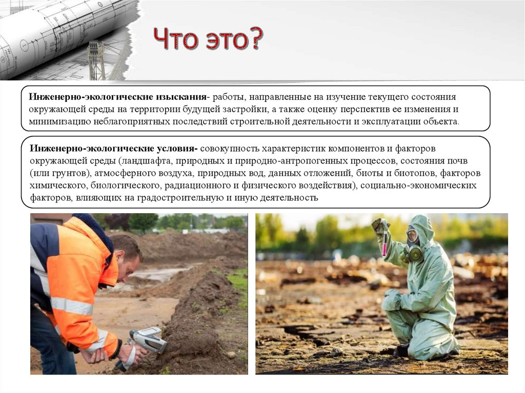 Инженерно-экологические изыскания- работы, направленные на изучение текущего состоянияокружающей среды на территории будущей застройки, а также оценку перспектив ее изменения и