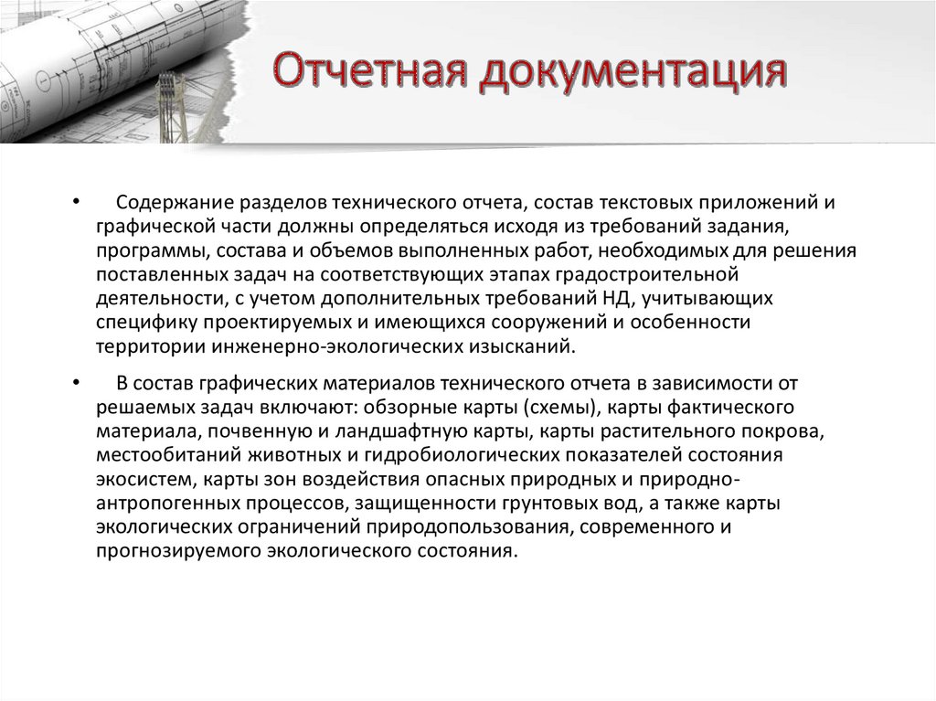 По результатам инженерно-экологических изысканий составляетсятехнический отчет(заключение) или раздел в сводном отчете по