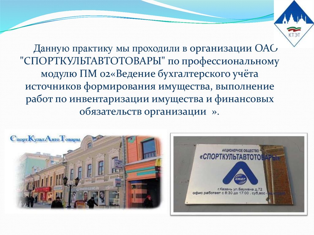 Данную практику мы проходили в организации ОАО"СПОРТКУЛЬТАВТОТОВАРЫ" по профессиональному