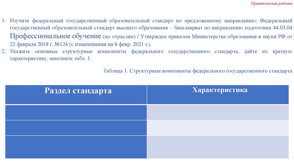 Практическая работа1. Изучите федеральный государственный образовательный стандарт по предложенному направлению: Федеральный