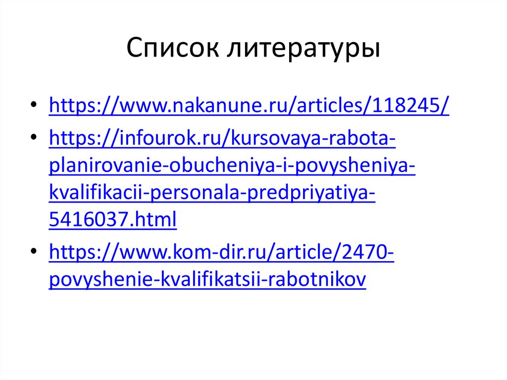 • https://infourok.ru/kursovaya-rabotaplanirovanie-obucheniya-i-povysheniyakvalifikacii-personala-predpriyatiya5416037.html