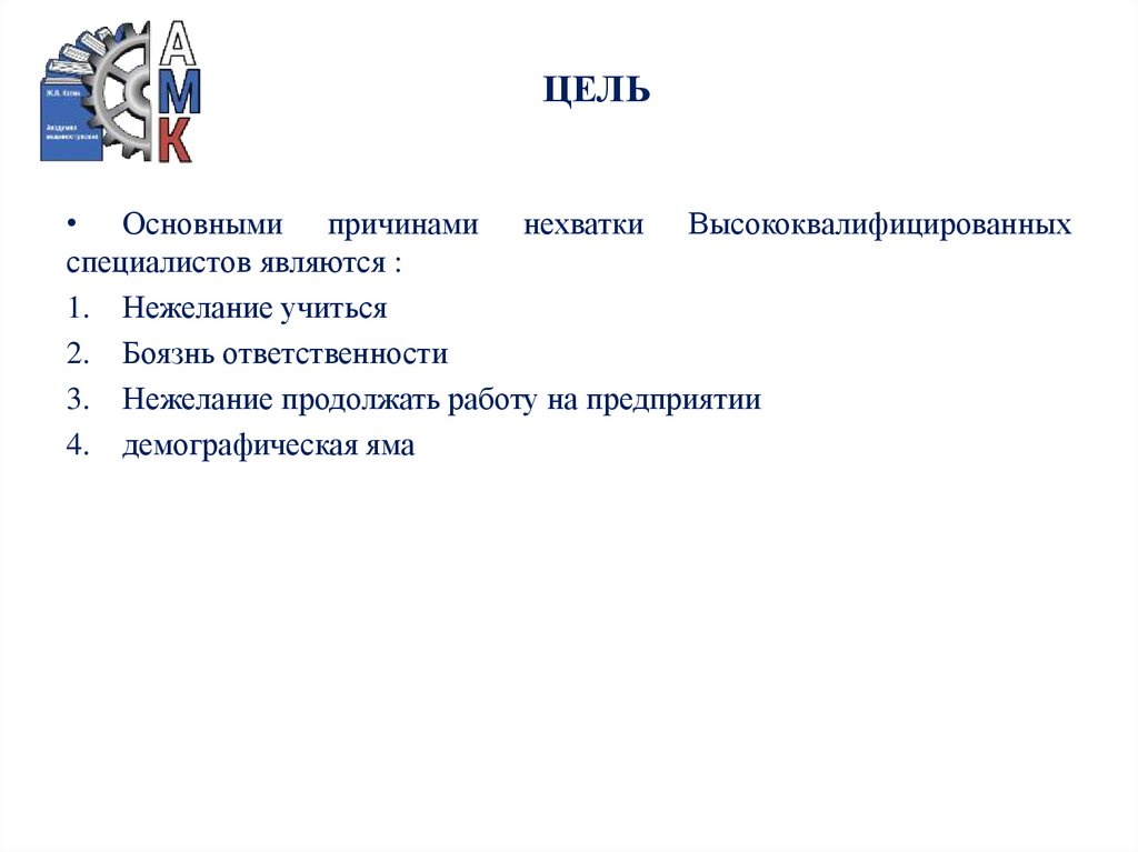 ЦЕЛЬ• Основными причинами нехватки Высококвалифицированных