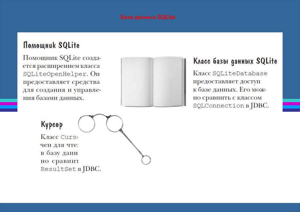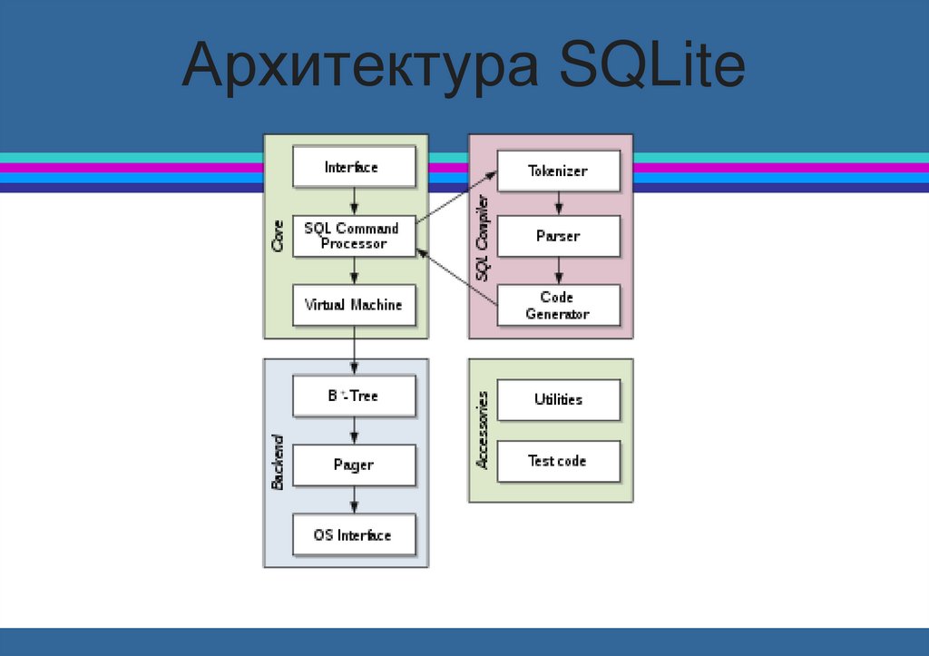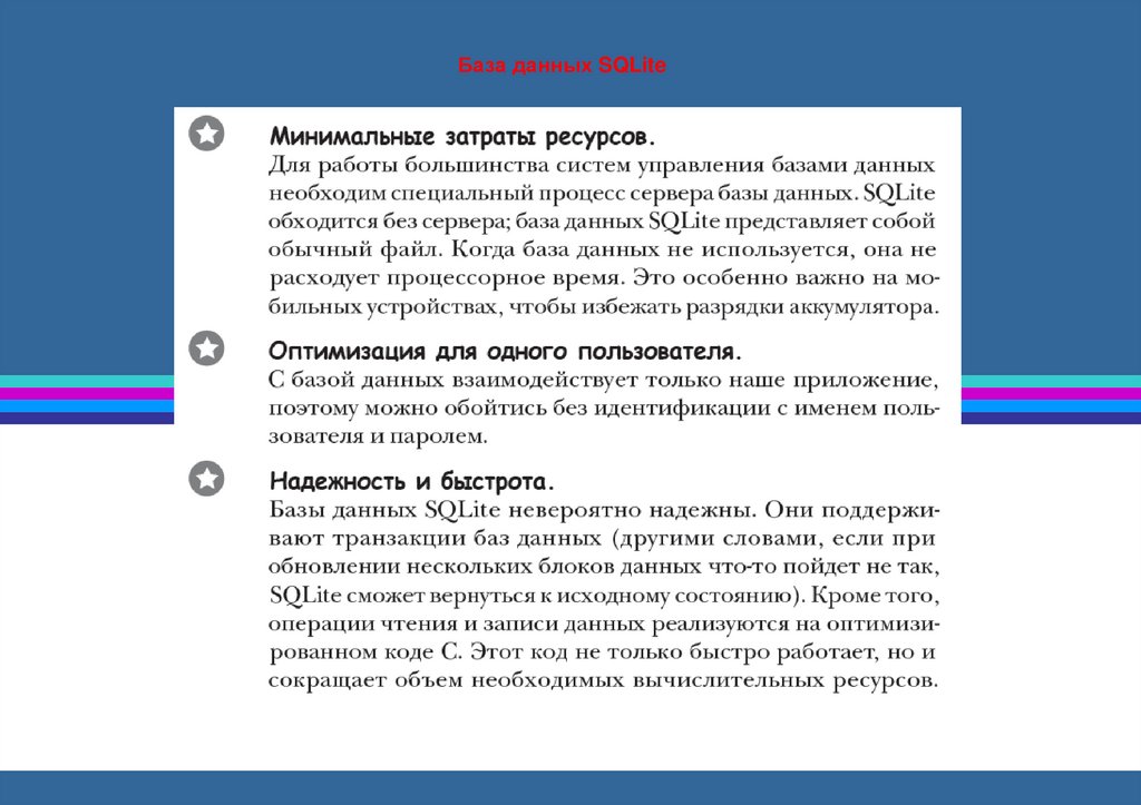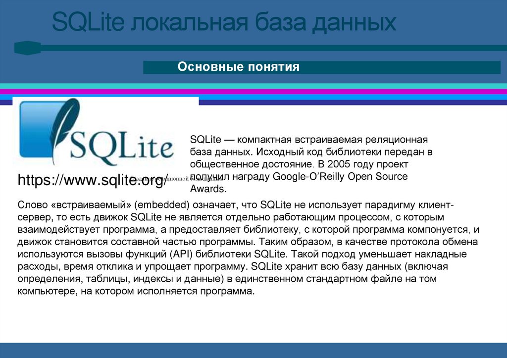 Слово «встраиваемый» (embedded) означает, что SQLite не использует парадигму клиентсервер, то есть движок SQLite не является отдельно работающим процессом, с которым