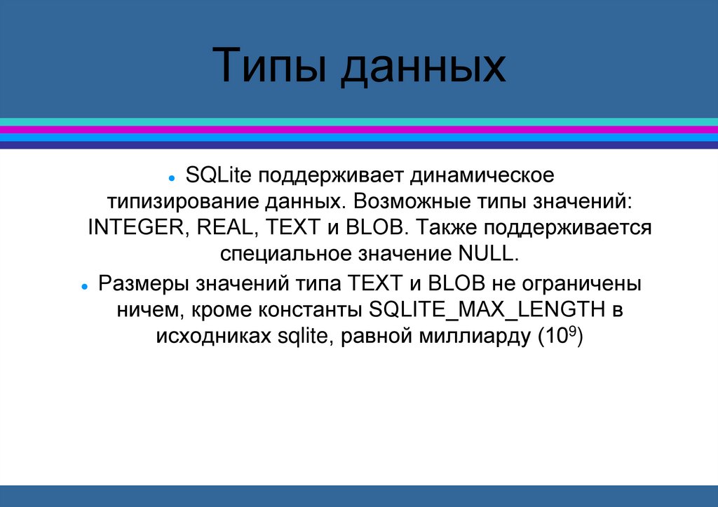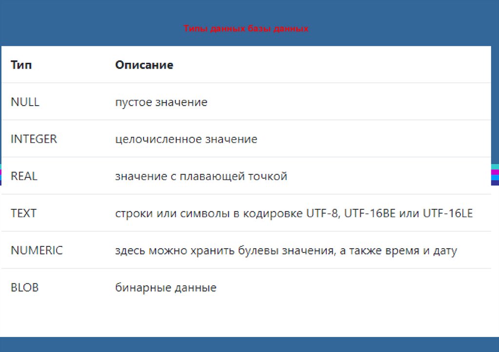 INTEGER, REAL, TEXT и BLOB. Также поддерживается