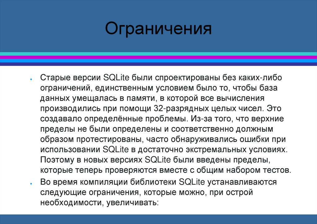ОграниченияСтарые версии SQLite были спроектированы без каких-либо