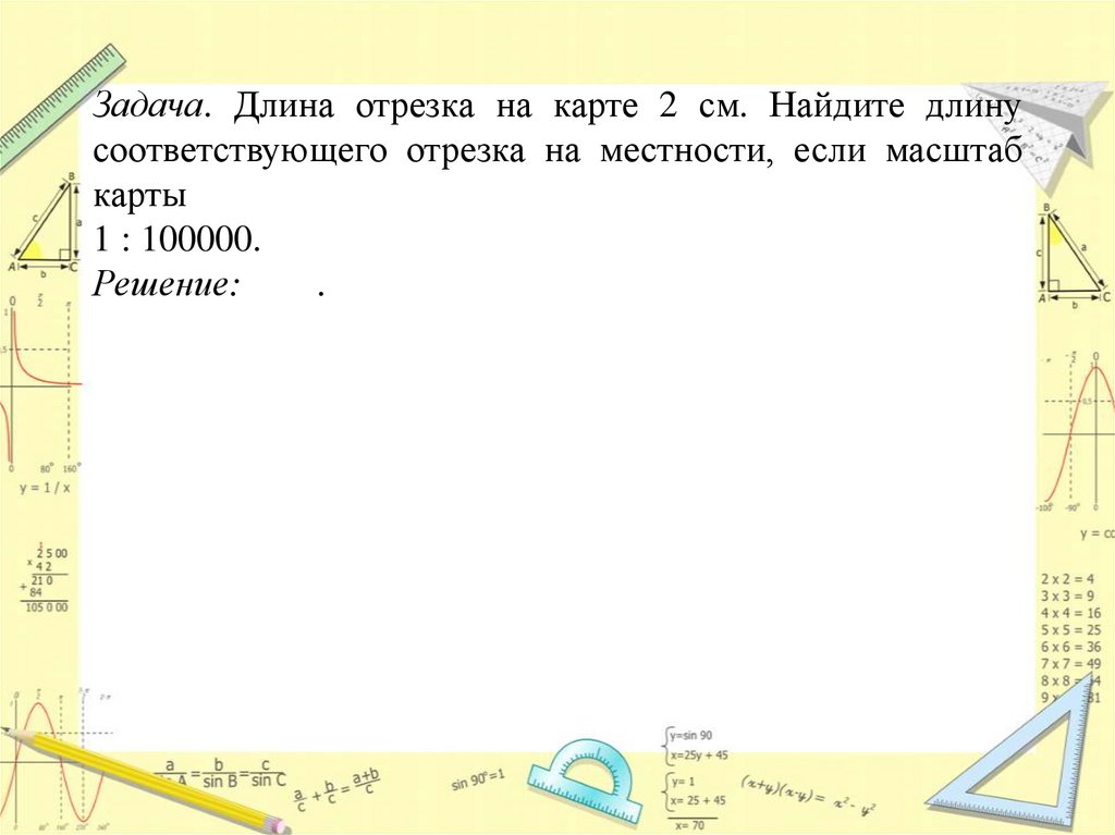 Задача. Длина отрезка на карте 2 см. Найдите длинусоответствующего отрезка на местности, если масштаб