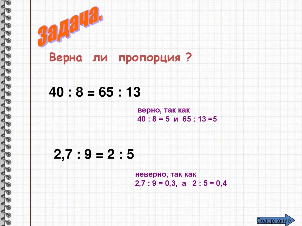 Верна ли пропорция ?40 : 8 = 65 : 13