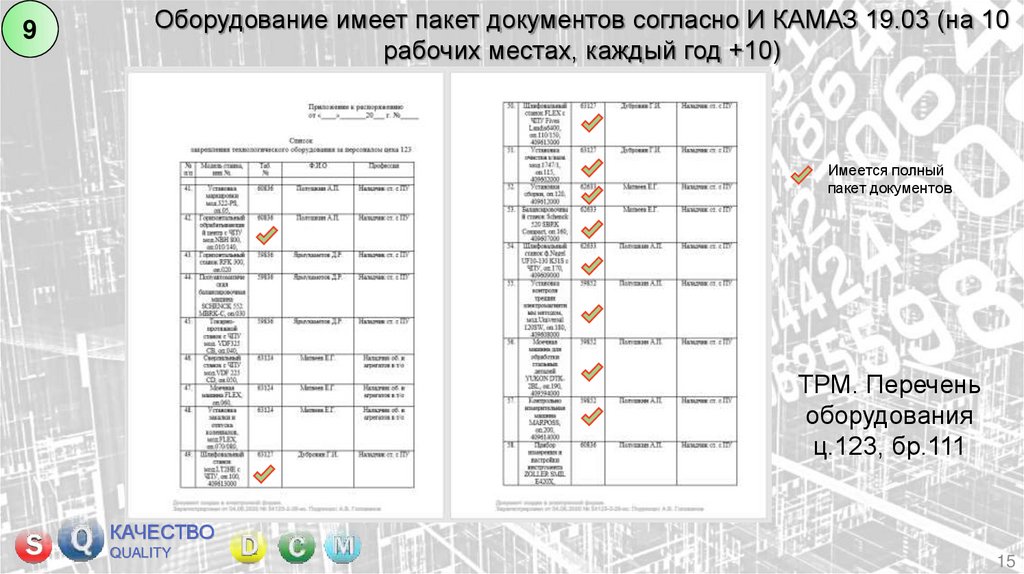 Оборудование имеет пакет документов согласно И КАМАЗ 19.03 (на 10рабочих местах, каждый год +10)