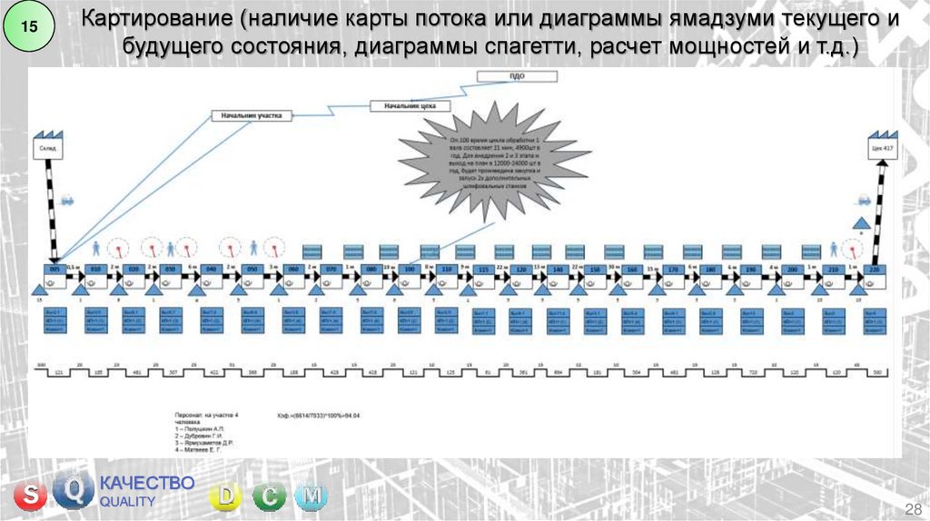 Картирование (наличие карты потока или диаграммы ямадзуми текущего и будущего состояния, диаграммы спагетти, расчет мощностей и т.д.)