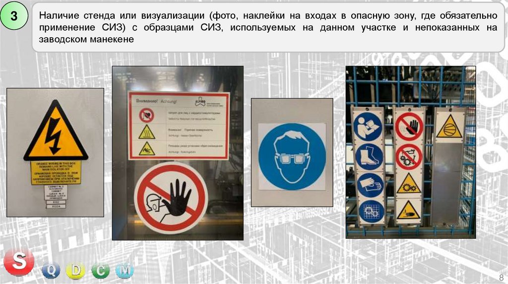 Наличие стенда или визуализации (фото, наклейки на входах в опасную зону, где обязательно применение СИЗ) c образцами СИЗ, используемых на