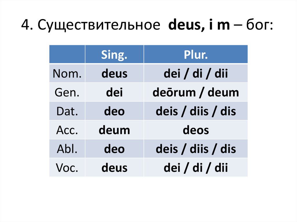 4. Существительное deus, i m – бог:Nom.