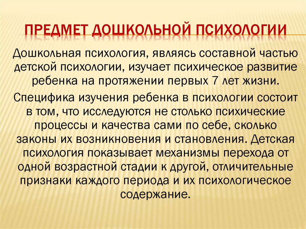 ПРЕДМЕТ ДОШКОЛЬНОЙ ПСИХОЛОГИИДошкольная психология, являясь составной частью
