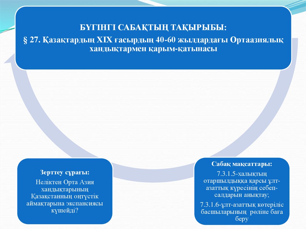 БҮГІНГІ САБАҚТЫҢ ТАҚЫРЫБЫ:§ 27. Қазақтардың ХІХ ғасырдың 40-60 жылдардағы Ортаазиялық