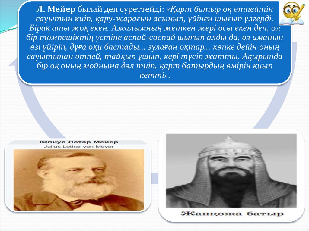 Л. Мейер былай деп суреттейді: «Қарт батыр оқ өтпейтінсауытын киіп, қару-жарағын асынып, үйінен шығып үлгерді.