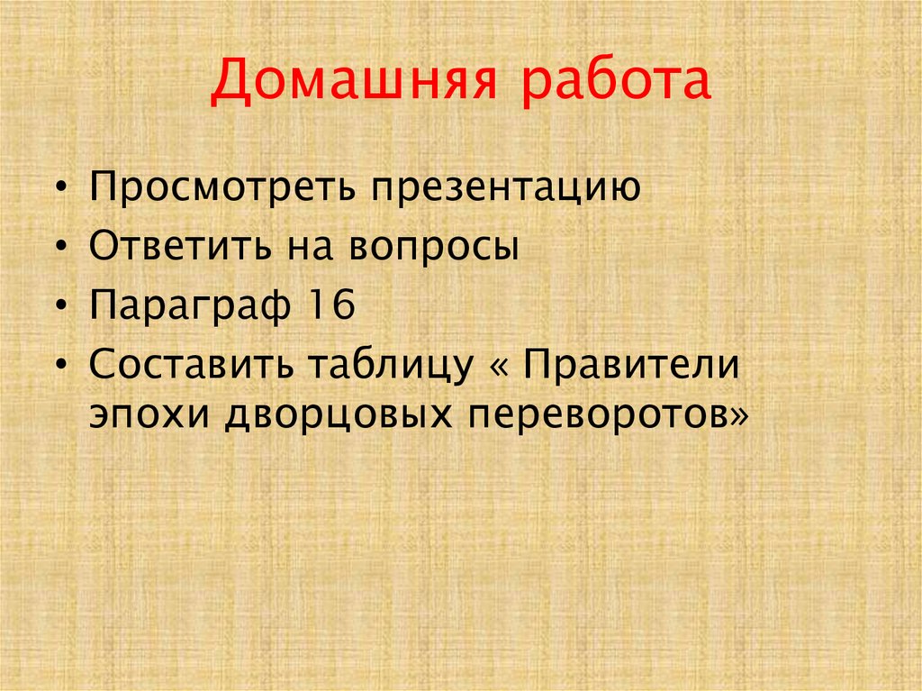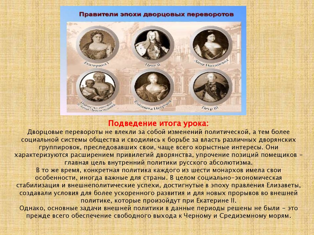 Подведение итога урока:Дворцовые перевороты не влекли за собой изменений политической, а тем более