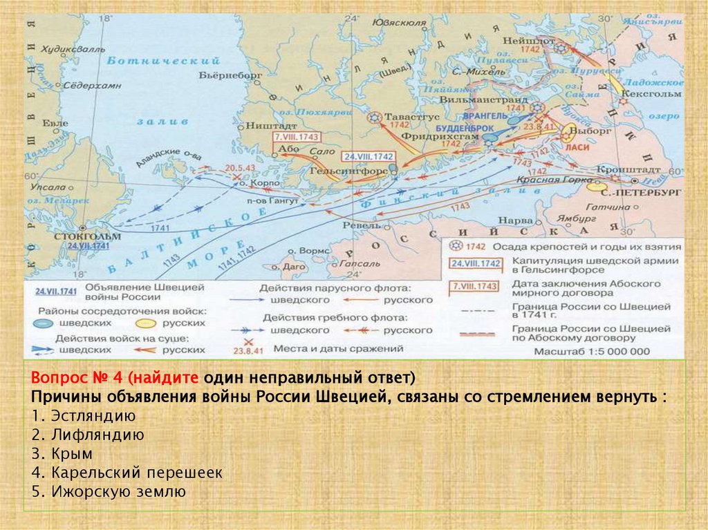 Вопрос № 4 (найдите один неправильный ответ)Причины объявления войны России Швецией, связаны со стремлением вернуть :