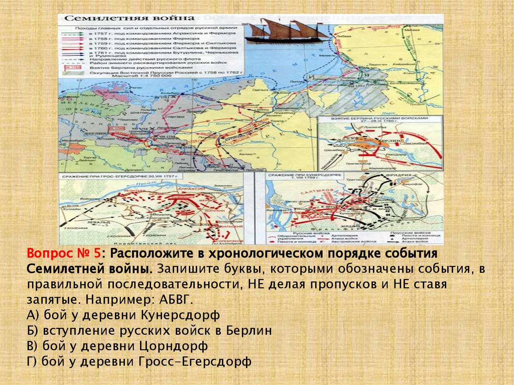 Вопрос № 5: Расположите в хронологическом порядке событияСемилетней войны. Запишите буквы, которыми обозначены события, в