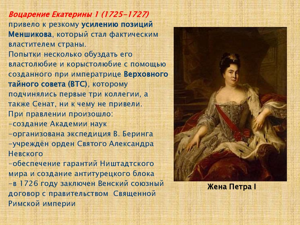 Воцарение Екатерины 1 (1725-1727)привело к резкому усилению позиций