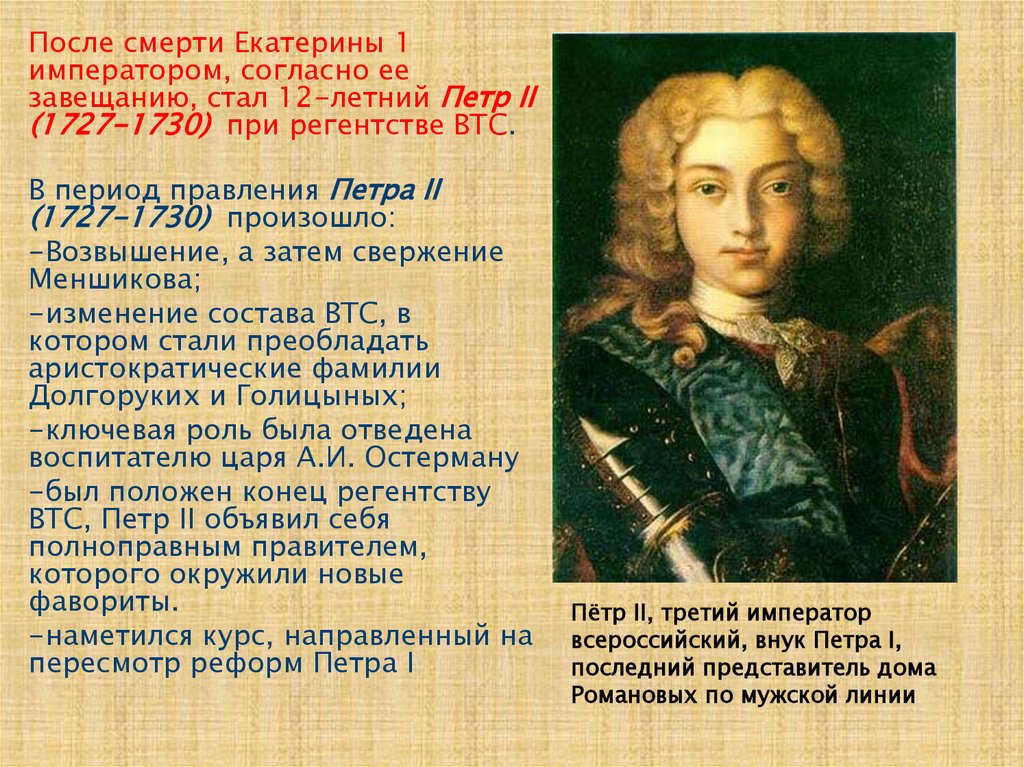 Умирая, Петр I не оставил наследника, успев лишь написатьслабеющей рукой: “Отдайте все...”, а далее начались