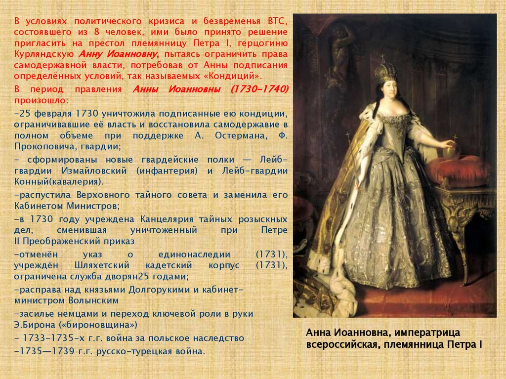-25 февраля 1730 уничтожила подписанные ею кондиции,