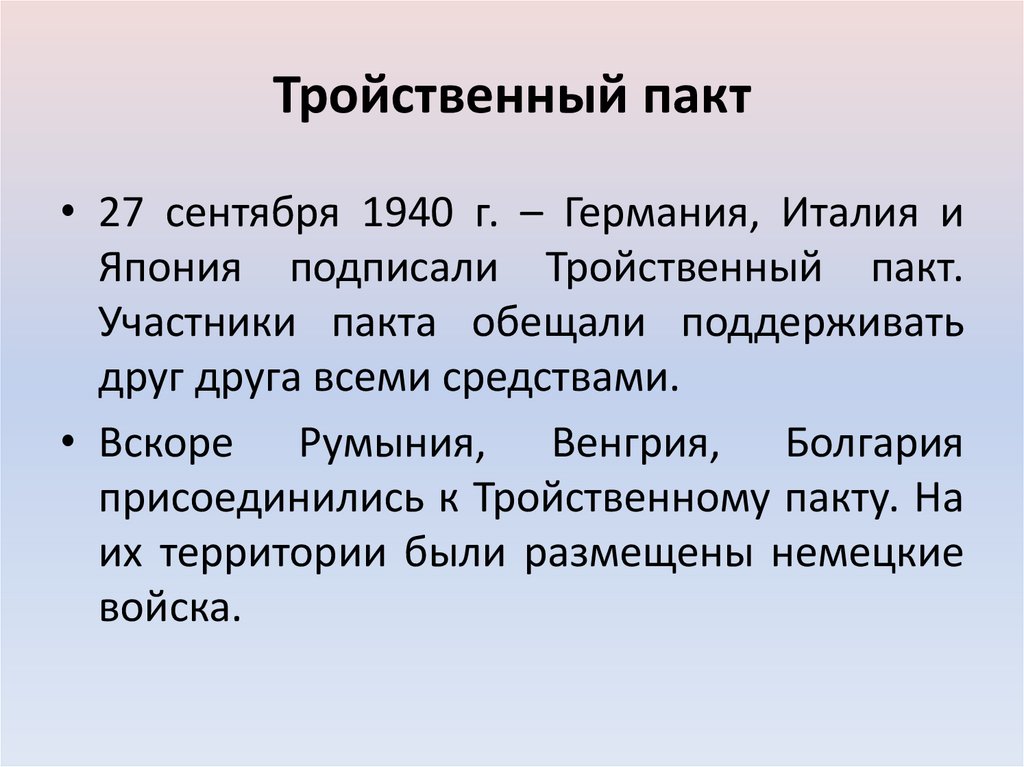 Тройственный пакт• 27 сентября 1940 г. – Германия, Италия и