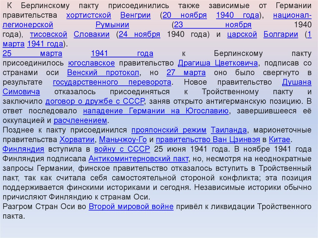 К Берлинскому пакту присоединились также зависимые от Германииправительства хортистской Венгрии (20 ноября 1940 года), националлегионерской