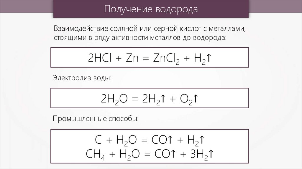 Получение водородаВзаимодействие соляной или серной кислот с металлами,