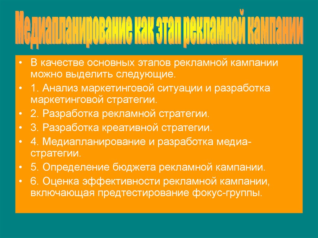 • В качестве основных этапов рекламной кампанииможно выделить следующие.
