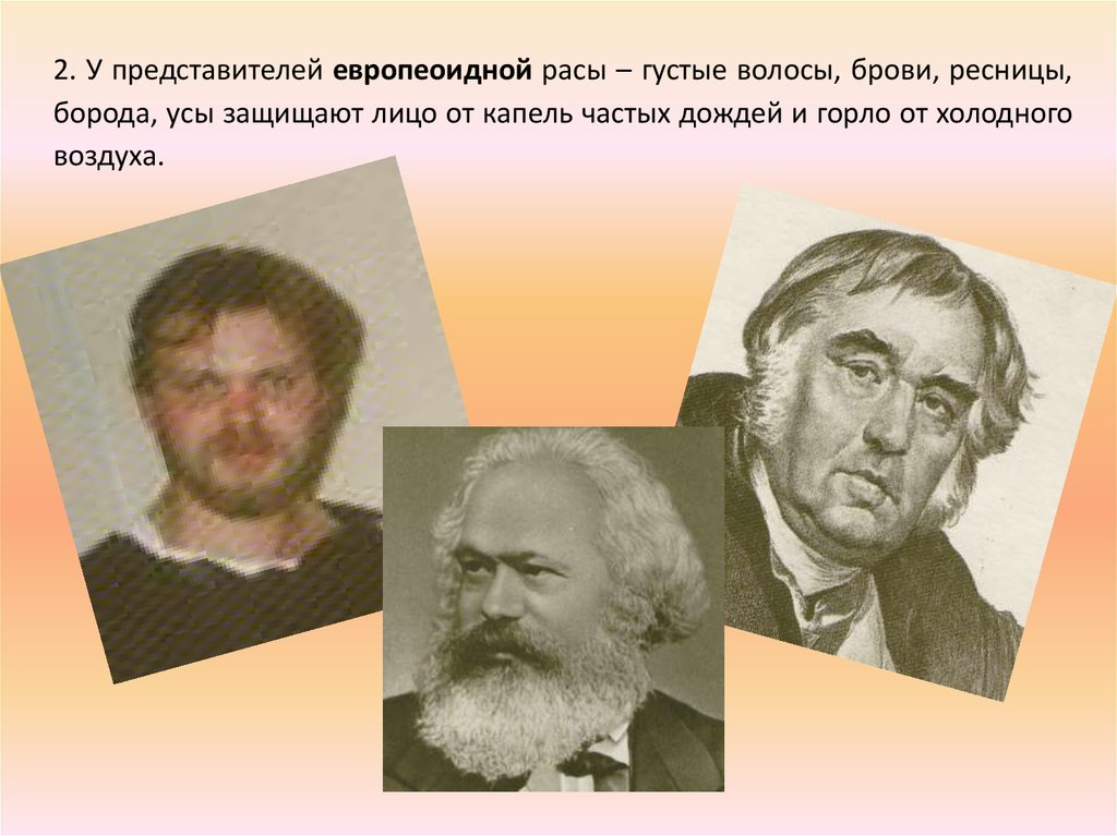 2. У представителей европеоидной расы – густые волосы, брови, ресницы,борода, усы защищают лицо от капель частых дождей и горло от холодного