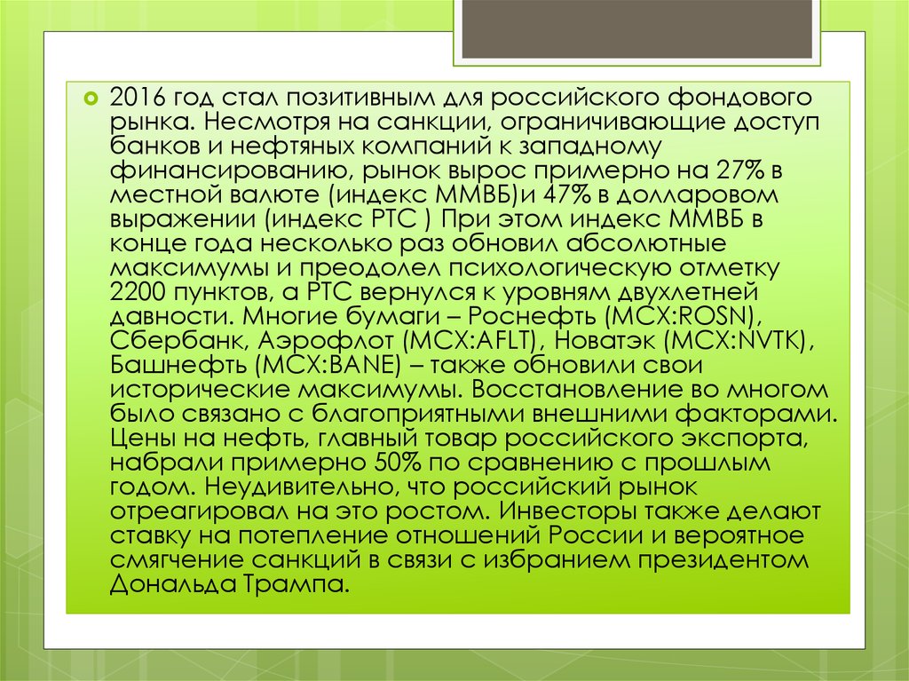 2016 год стал позитивным для российского фондовогорынка. Несмотря на санкции, ограничивающие доступ
