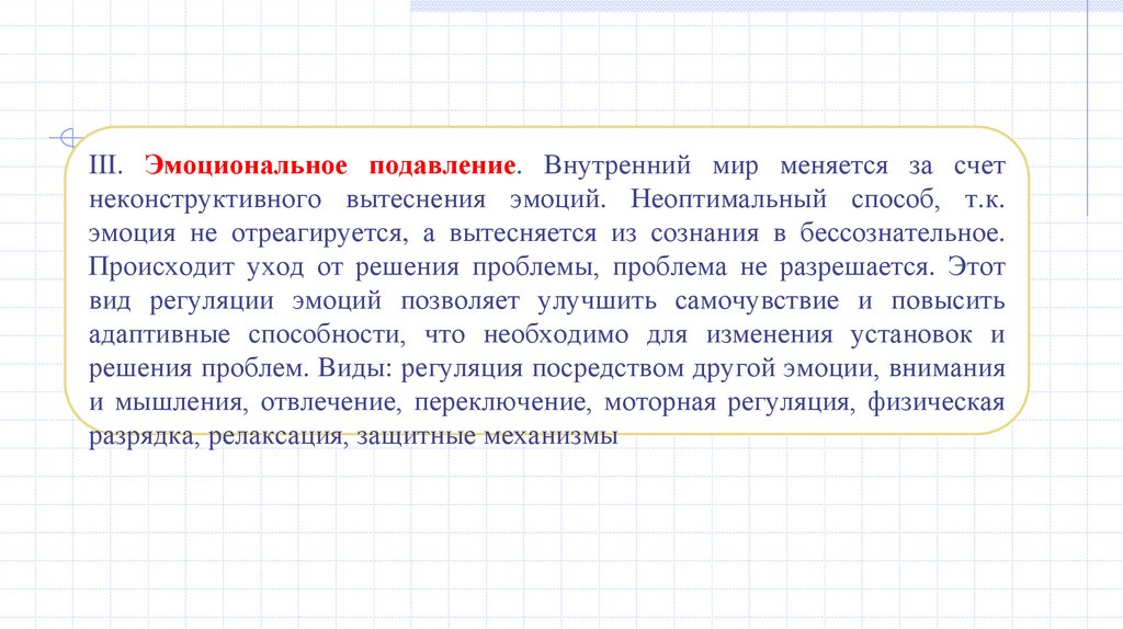 III. Эмоциональное подавление. Внутренний мир меняется за счетнеконструктивного вытеснения эмоций. Неоптимальный способ, т.к.