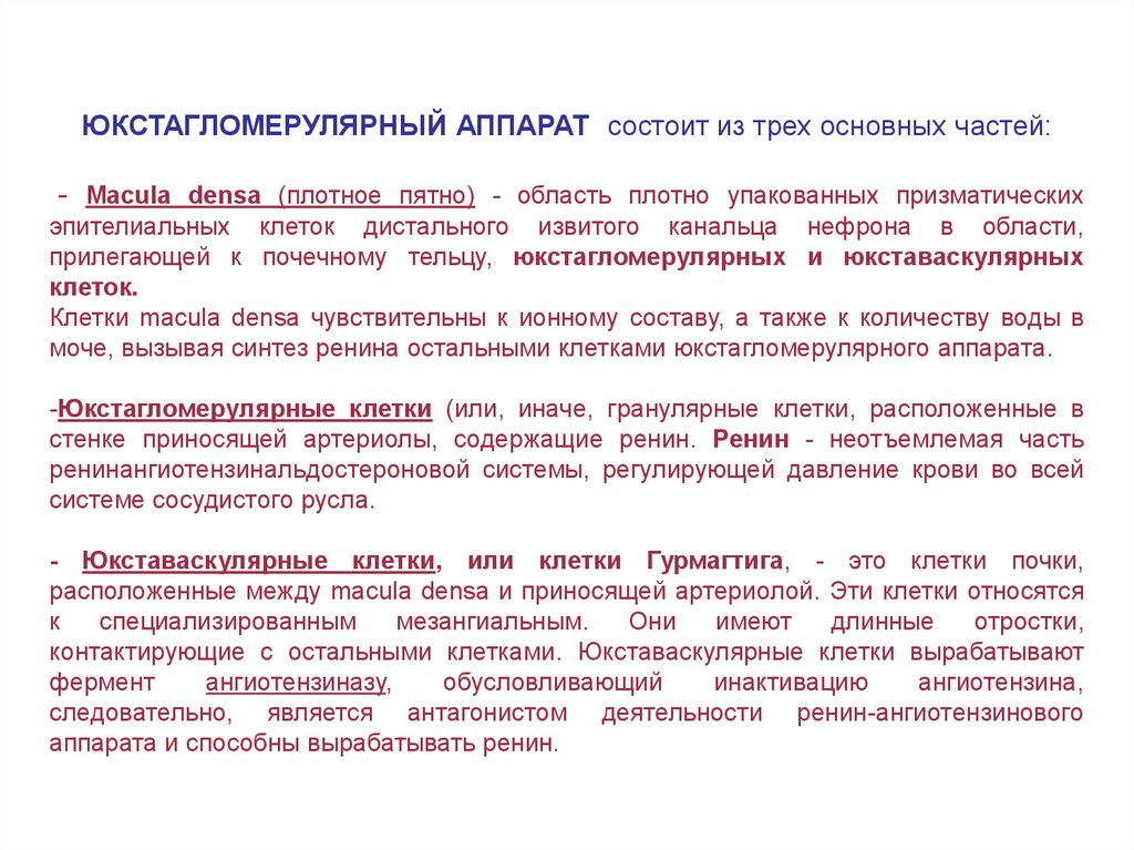 ЮКСТАГЛОМЕРУЛЯРНЫЙ АППАРАТ состоит из трех основных частей:- Macula densa (плотное пятно) - область плотно упакованных призматических