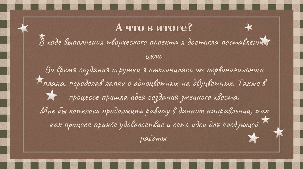 А что в итоге?В ходе выполнения творческого проекта я достигла поставленной