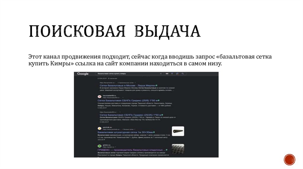 Этот канал продвижения подходит, сейчас когда вводишь запрос «базальтовая сеткакупить Кимры» ссылка на сайт компании находиться в самом низу.
