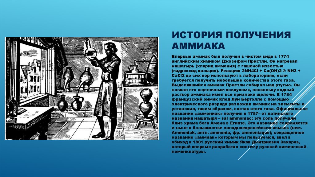 Впервые аммиак был получен в чистом виде в 1774