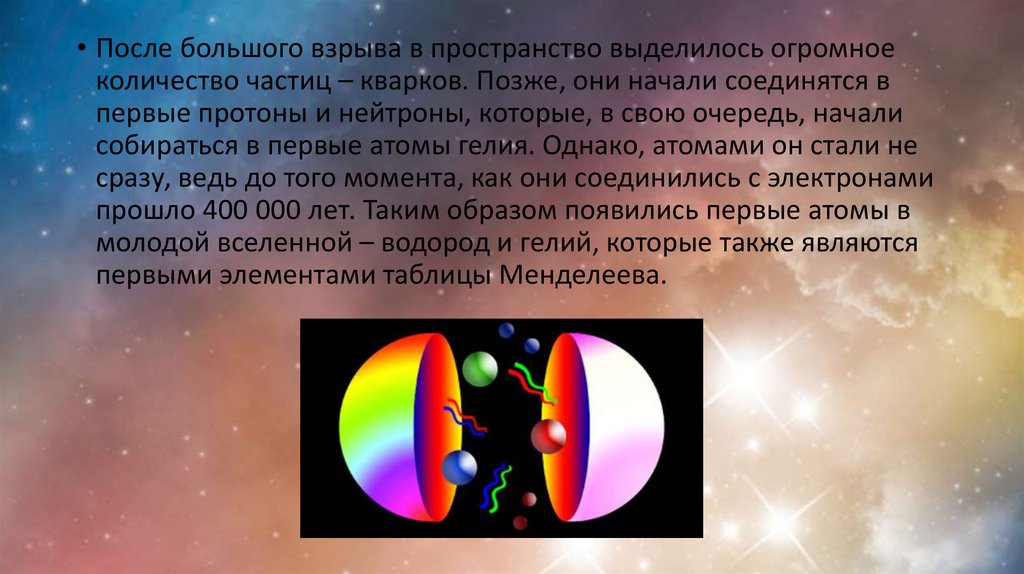 • После большого взрыва в пространство выделилось огромноеколичество частиц – кварков. Позже, они начали соединятся в