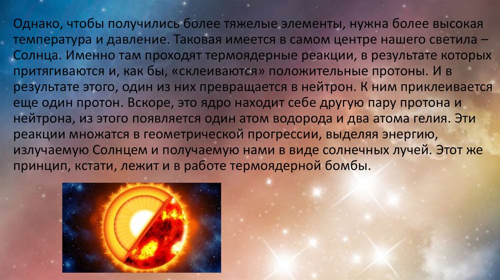 Однако, чтобы получились более тяжелые элементы, нужна более высокаятемпература и давление. Таковая имеется в самом центре нашего светила –