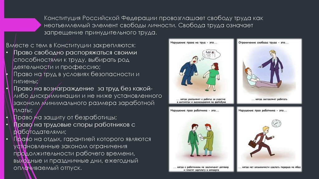 Конституция Российской Федерации провозглашает свободу труда какнеотъемлемый элемент свободы личности. Свобода труда означает