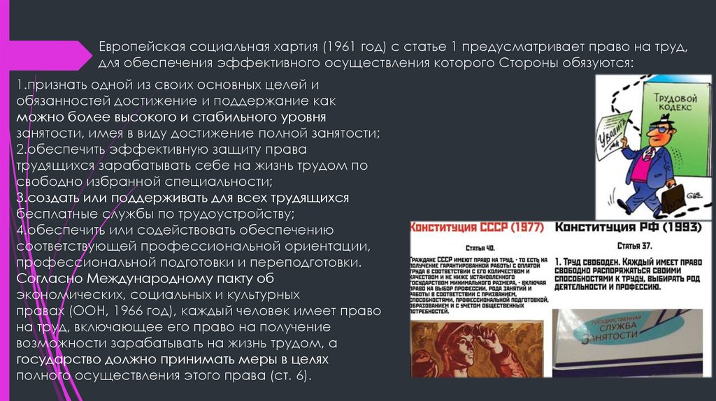 Европейская социальная хартия (1961 год) с статье 1 предусматривает право на труд,для обеспечения эффективного осуществления которого Стороны обязуются: