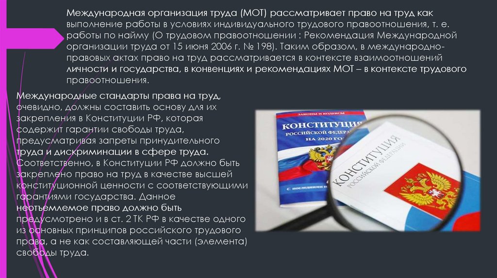 Международная организация труда (МОТ) рассматривает право на труд каквыполнение работы в условиях индивидуального трудового правоотношения, т. е.